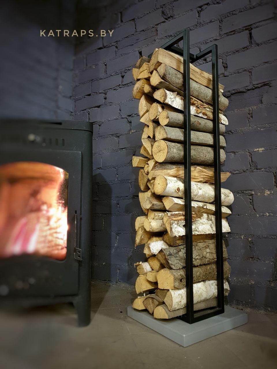 Дровница выполнена из прокатанной металлической профильной трубы и покрыта полимером. Цвет корпуса - чёрный, цвет подставки - серый.
