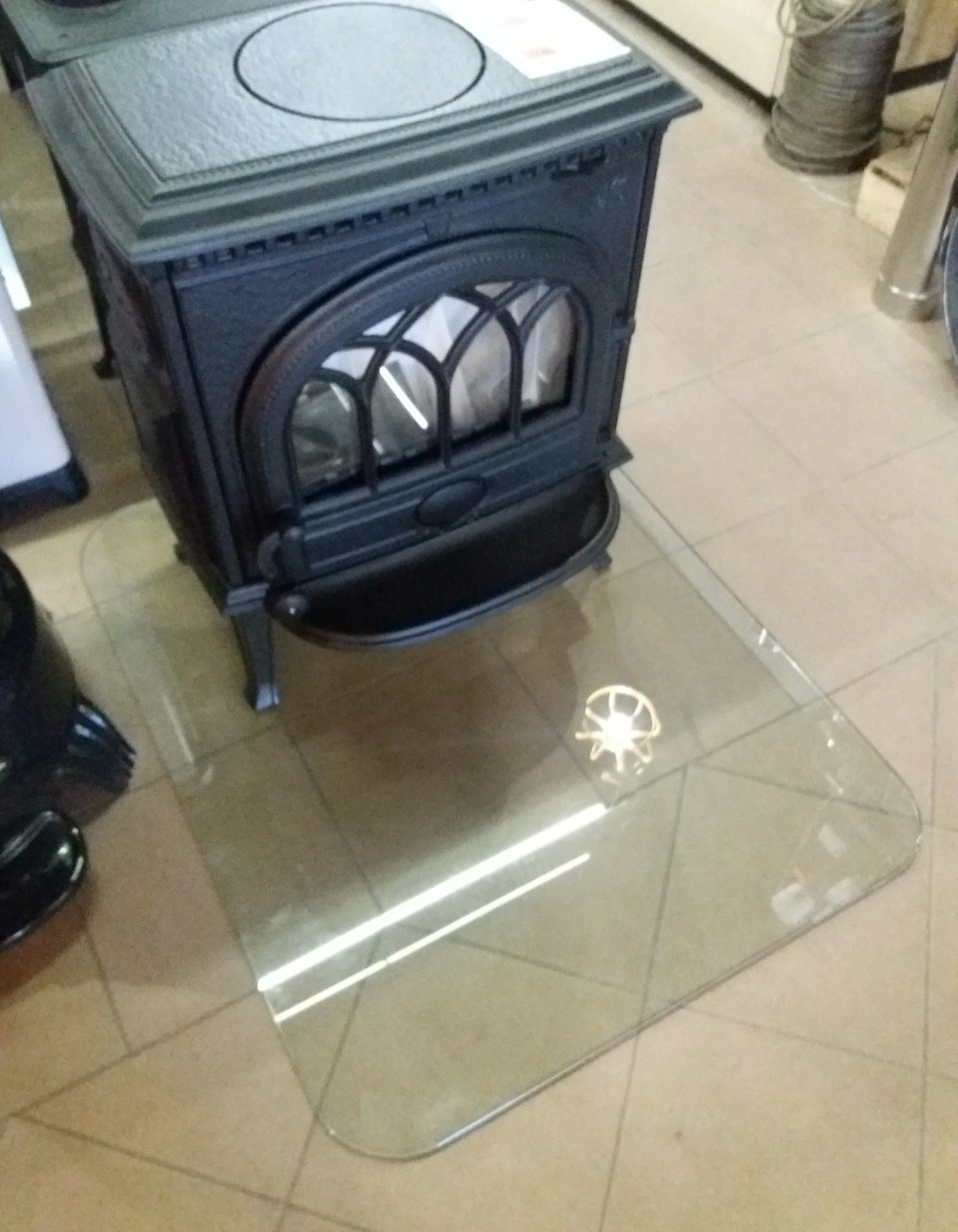 Закаленное стекло толщиной 8мм, прямоугольное со скруглениями. Выполняет как декоративную функцию, так и функцию защиты от пожара. Оно является предтопочным листом, который защищает пол из сгораемых материалов от искр из печи-камина. Под печью не требуется установка термоизолирующего материала, так как сильно нагреваются только бока и верх печи, а стекло служит только для защиты от искр. При этом стекло смотрится очень эффектно.
