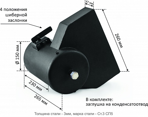 Переходник печной с шибером для КВО "Сибирь-10/15/20 кВт", "Гефест 15/20 кВт", "Магнум 15/20 кВт". Масса переходника составляет 6 кг, он изготовлен из стали марки Ст.3 СП 5 толщиной 3 мм. Служит для: