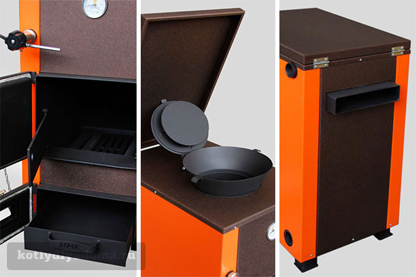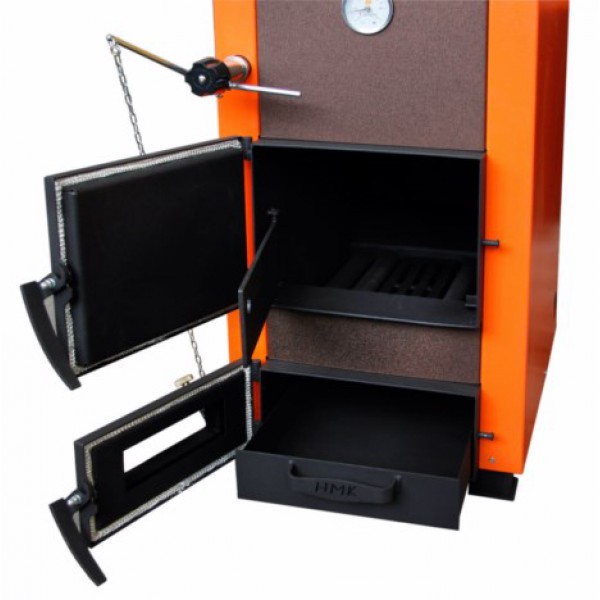 Котел состоит из корпуса, состоящий из патрубка дымохода, водонаполненного колосника, водонаполненного теплообменника. Для универсальности подключения котла с левой и правой стороны установлены патрубки подачи и обратки. После подключения котла к системе отопления с обратной стороны в патрубок подачи устанавливается заглушка, а в патрубок обратки устанавливается блок ТЭНа. На лицевой стороне установлен патрубок, в который устанавливается заглушка, по желанию покупателя в данный патрубок может быть установлен регулятор тяги (поставляется отдельно). Также на лицевой стороне установлены термометр для контроля температуры теплоносителя в котле и две дверцы: