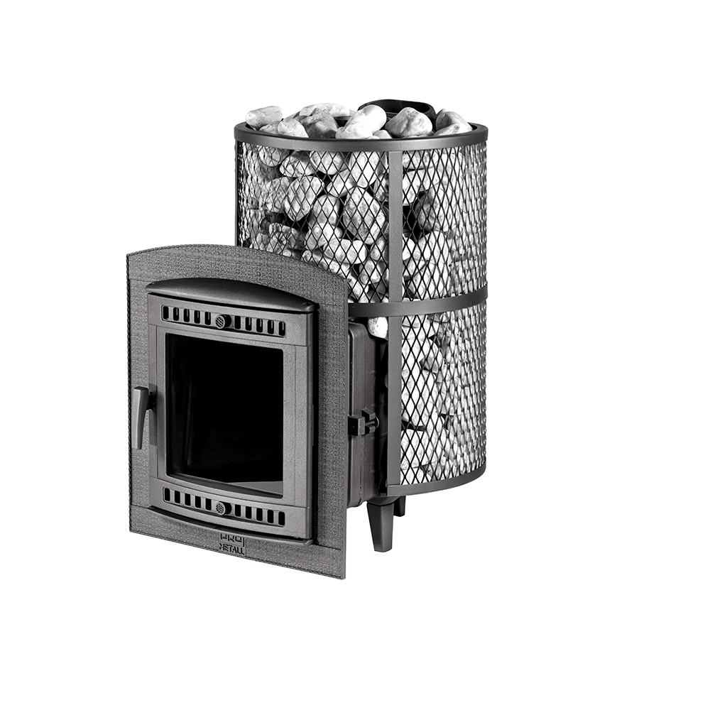 Печь для бани ПроМеталл «Атмосфера» выполнена из цельнолитого корпуса из чугуна толщиной 9 мм с добавлением хрома. Модели этих печей имеют повышенную эффективность горения за счет использования вихревой технологии, которая увеличивает теплоотдачу за счет усиленного притока воздуха непосредственно в камеру сгорания. Сейчас существует два варианта наружного оформления банных печей ProMetall. Первый это сетчатый кожух с заполнением камнями, или же с облицовкой корпуса полированными ламелями из натурального камня.