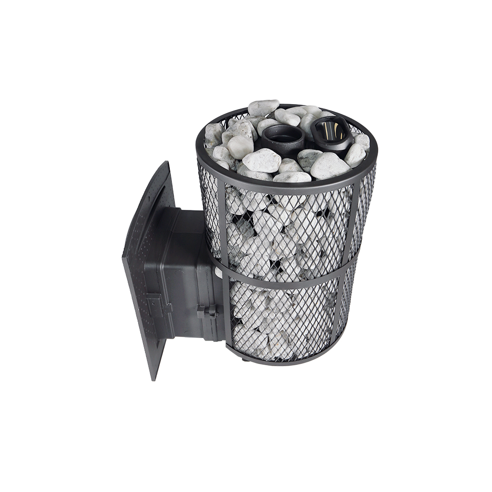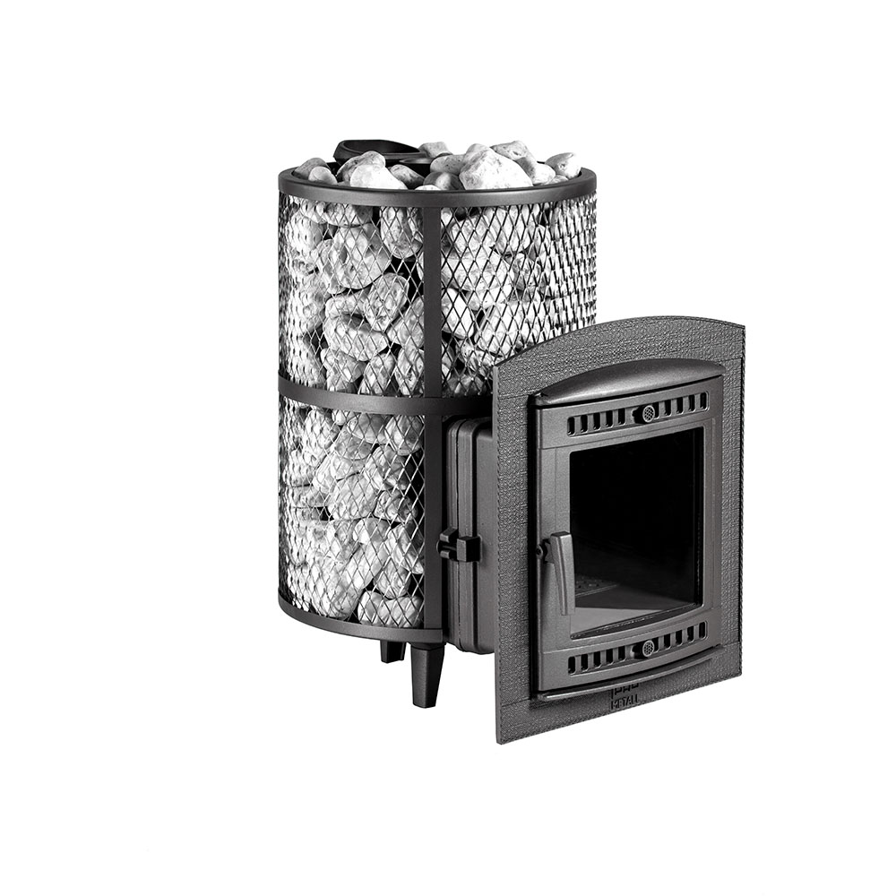 Печь для бани ПроМеталл «Атмосфера» выполнена из цельнолитого корпуса из чугуна толщиной 9 мм с добавлением хрома. Модели этих печей имеют повышенную эффективность горения за счет использования вихревой технологии, которая увеличивает теплоотдачу за счет усиленного притока воздуха непосредственно в камеру сгорания. Сейчас существует два варианта наружного оформления банных печей ProMetall. Первый это сетчатый кожух с заполнением камнями, или же с облицовкой корпуса полированными ламелями из натурального камня.