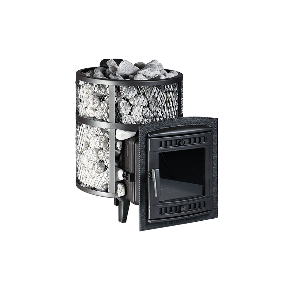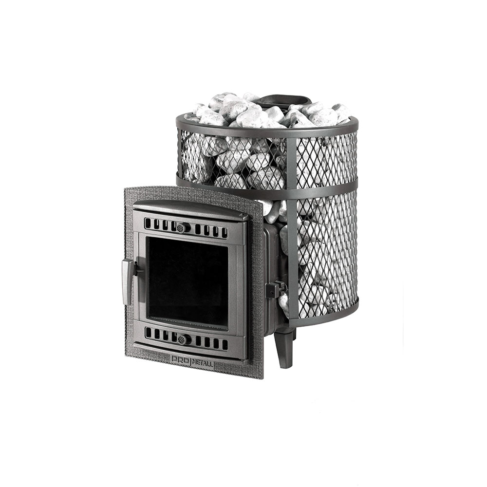Печь для бани ПроМеталл «Атмосфера» выполнена из цельнолитого корпуса из чугуна толщиной 9 мм с добавлением хрома. Модели этих печей имеют повышенную эффективность горения за счет использования вихревой технологии, которая увеличивает теплоотдачу за счет усиленного притока воздуха непосредственно в камеру сгорания. Сейчас существует два варианта наружного оформления банных печей ProMetall. Первый это сетчатый кожух с заполнением камнями, или же с облицовкой корпуса полированными ламелями из натурального камня.