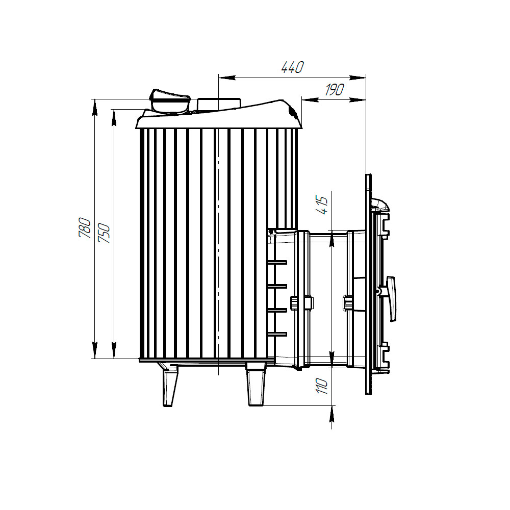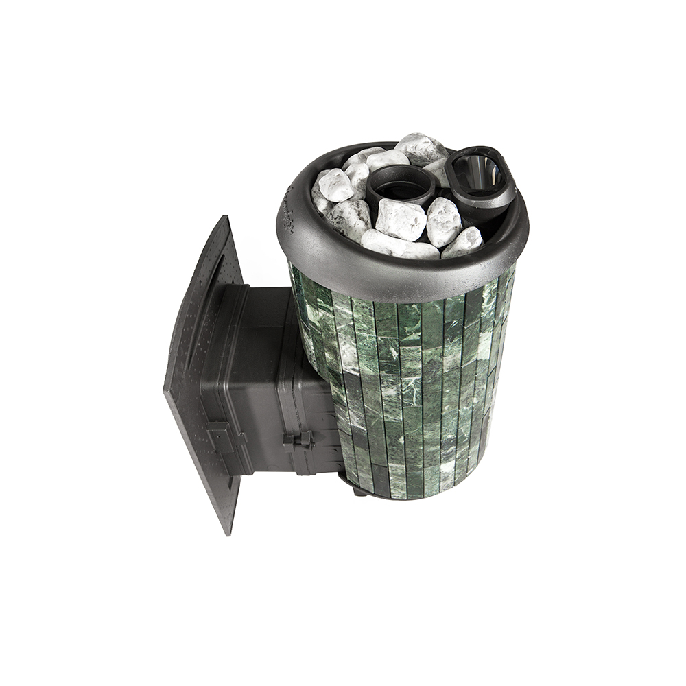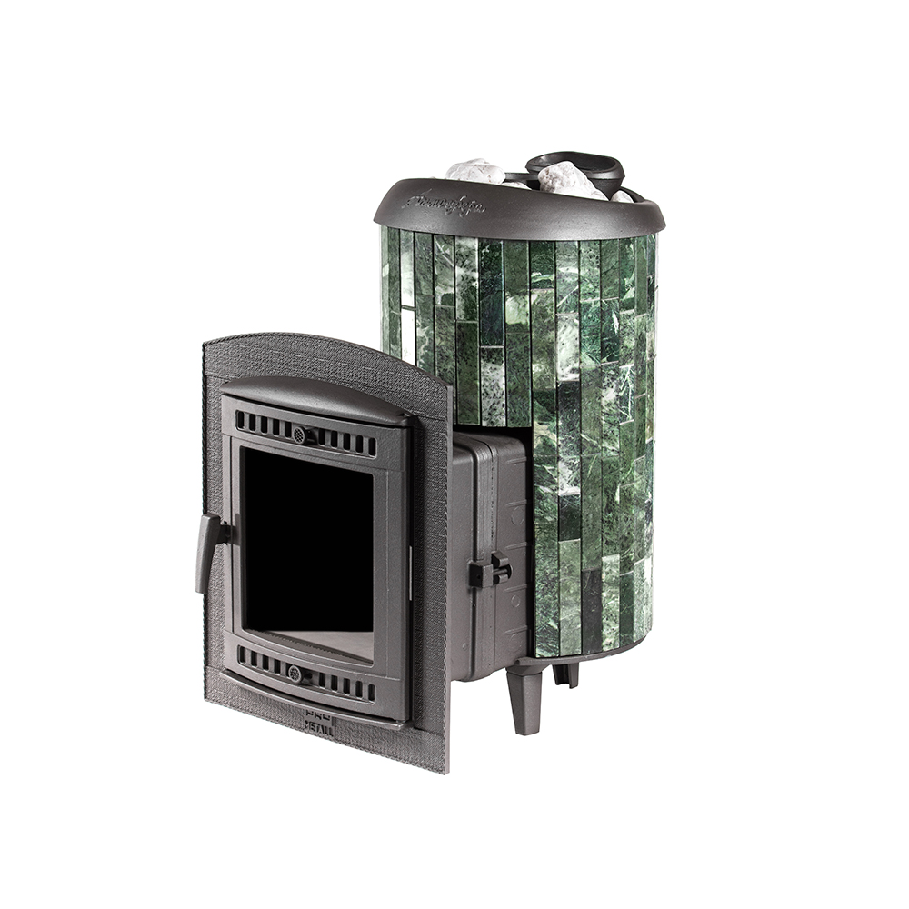 Декоративный портал и выносная дверка печки также изготовлены из чугуна, с возможностью варьирования длины топочного тоннеля под необходимую толщину стенки. Большое термостойкое стекло в дверце имеет защиту от копоти воздушной специальной завесой. На раме дверцы установлены два воздухозаборника для подачи воздуха на горение. Предусмотрена возможность размещения дверцы как с левой, так и с правой стороны. В банную печь Атмосфера встроен генератор пара, что помогает создавать в парилке различные режимы температуры и влажности. Практичная и компактная модель. Ламели из змеевика по периметру внешней каменки не только обладают хорошими теплонакопительными свойствами, но и придают печи оригинальный внешний вид.