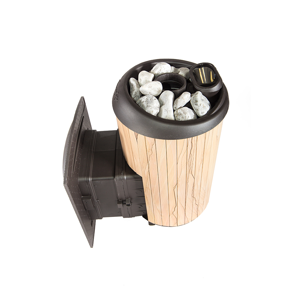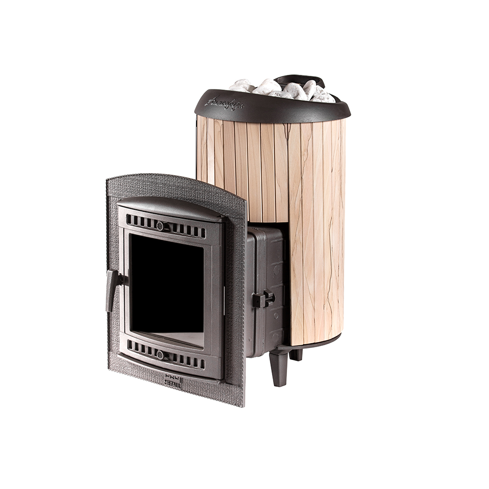 Печь для бани ПроМеталл «Атмосфера» выполнена из цельнолитого корпуса из чугуна толщиной 9 мм с добавлением хрома. Модели этих печей имеют повышенную эффективность горения за счет использования вихревой технологии, которая увеличивает теплоотдачу за счет усиленного притока воздуха непосредственно в камеру сгорания. Сейчас существует два варианта наружного оформления банных печей ProMetall. Первый это сетчатый кожух с заполнением камнями, или же с облицовкой корпуса полированными ламелями из натурального камня.