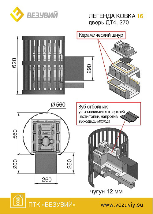 Преимущество печи в том, что топка печи состоит из 3-х элементов. На стыке между ними используется керамический шнур с рабочей температурой 1200 градусов. То есть топка печи абсолютно герметична! Для фиксации деталей между собой применяется болтовое соединение, что даёт 100% гарантию безопасности при эксплуатации.