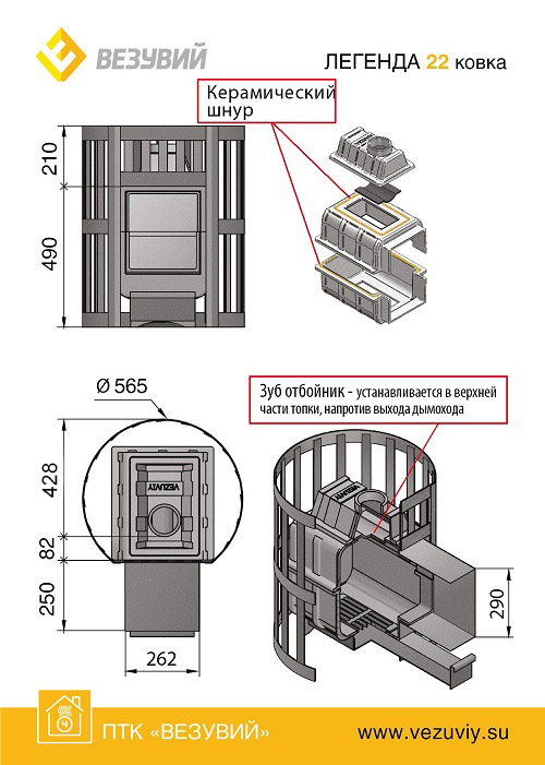 Преимущество печи в том, что топка печи состоит из 3-х элементов. На стыке между ними используется керамический шнур с рабочей температурой 1200 градусов. То есть топка печи абсолютно герметична! Для фиксации деталей между собой применяется болтовое соединение, что даёт 100% гарантию безопасности при эксплуатации.