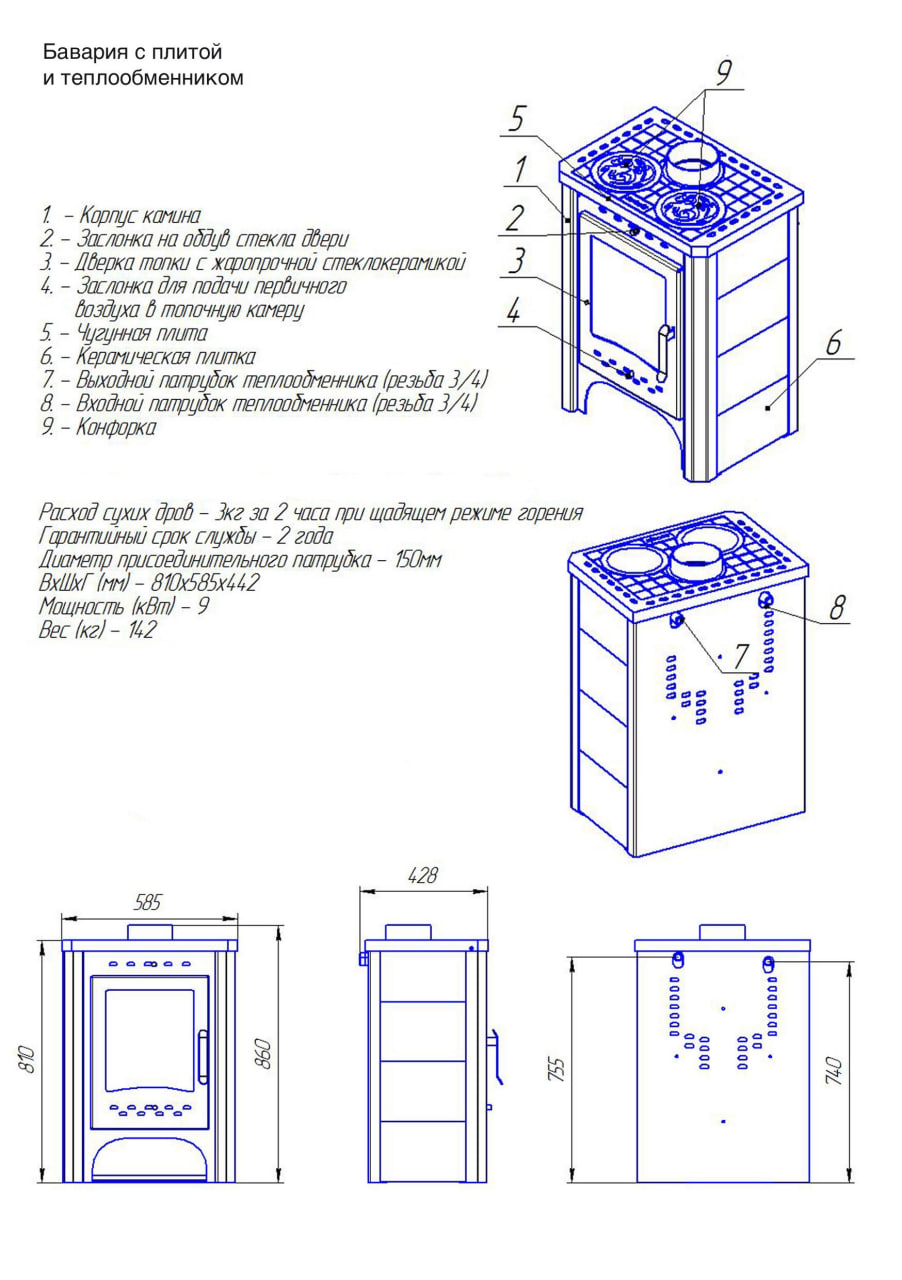Данная модель печи позиционируется как многоцелевая, так как предназначена одновременно для обогрева дома и приготовления пищи. Чугунная плита оснащена двумя функционирующими конфорками. Так же печь оснащена теплообменником.