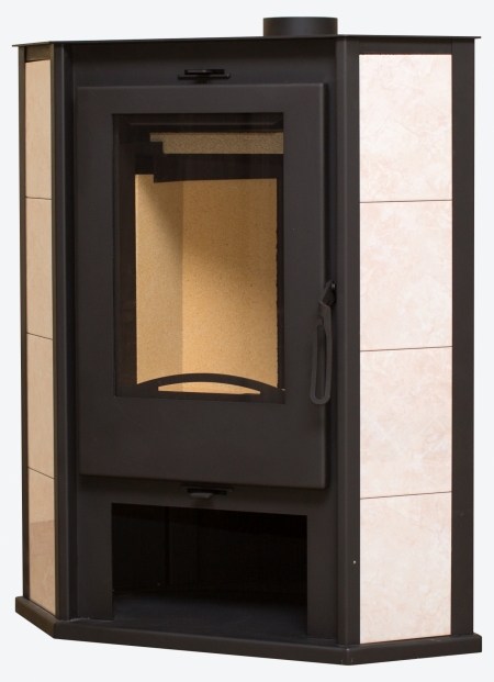 Компактная угловая печь с диаметром дымоходного патрубка 115 мм. Печь оснащена системой «регулируемого вторичного дожига». Верхняя панель оборудована чугунной варочной плитой. Идеально подходит для обогрева небольшого загородного домика площадью 30-60 м2. Кроме обогрева помещения можно разогреть пищу или вскипятить чайник. Размер поленьев 25 -27 см. Подсоединение к дымоходу сверху.