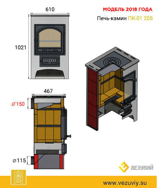 Печь-камин ПК-01 (205) - от производителя Везувий. Работает на дровах. Предназначеная для обогрева помещений (дома, дачи) объемом до 200 м3. Для изготовления дровяной печи Везувий ПК-01 (205) используют высококачественную конструкционную сталь, что обеспечивает продолжительный срок службы более 10 лет. Элементы печи Везувий ПК-01 (205) выполнены из чугуна. Печь оснащена дверью Везувий 205, которая имеет жаропрочное стекло. Сверху печи расположена чугунная варочная плита, что позволяет готовить на ней пищу. В данной модели предусмотрен теплообменник. Футеровка топки изложена шамотом из высококачественного сырья, по бокам печи Везувий керамические вставки. Печь-камин Везувий ПК-01 (205) бежевый с плитой и теплообменником работает до 5 часов на одной закладке дров. Также в печи предусмотрен - «Турбореактивный» режим разогрева, он обеспечивается за счёт подключения электрического вентилятора.