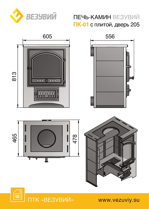 Печь-камин ПК-01 (205) - от производителя Везувий. Работает на дровах. Предназначена для обогрева помещений (дома, дачи) объемом до 200 м3. Для изготовления дровяной печи Везувий ПК-01 (205) используют высококачественную конструкционную сталь, что обеспечивает продолжительный срок службы более 10 лет. Элементы печи Везувий ПК-01 (205) выполнены из чугуна. Печь оснащена дверью Везувий 205, которая имеет жаропрочное стекло. Сверху печи расположена чугунная варочная плита, что позволяет готовить на ней пищу. В данной модели предусмотрен теплообменник. Футеровка топки изложена шамотом из высококачественного сырья, по бокам печи Везувий керамические вставки.Печь-камин Везувий ПК-01 (205) с плитой красный работает до 5 на одной закладке дров. Также в печи предусмотрен «Турбореактивный» режим разогрева, он обеспечивается за счёт подключения электрического вентилятора.