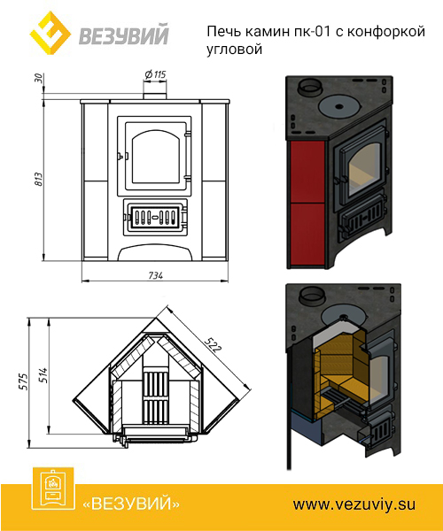 Угловая Печь-камин ПК-01 (220) красный - от производителя Везувий. Работает на дровах. Предназначеная для обогрева помещений объемом до 150 м3. Для изготовления дровяной печи Везувий ПК-01 (220) используют высококачественную конструкционную сталь. Элементы печи-камина Везувий ПК-01 (220) выполнены из чугуна. Дровяная печь Везувий ПК-01 (220) оснащена дверью Везувий 220, которая имеет жаропрочное стекло. Футеровка топки изложена шамотом из высококачественного сырья, по бокам печи Везувий керамические вставки. Печь-камин Везувий ПК-01 (220) угловой красный работает до 5 часов длительного горения на одной закладке дров. Также в печи предусмотрен - «Турбореактивный» режим разогрева, он обеспечивается за счёт подключения электрического вентилятора.