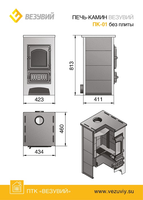 Печь-камин ПК-01 (270) от производителя Везувий. Работает на дровах. Предназначеная для обогрева помещений (дома, дачи) объемом до 150 м3. Для изготовления дровяной печи Везувий ПК-01 (270) используют высококачественную конструкционную сталь, что обеспечивает продолжительный срок службы более 10 лет. Элементы печи Везувий ПК-01 (270) выполнены из чугуна. Печь оснащена дверью Везувий 270, которая имеет жаропрочное стекло. Футеровка топки изложена шамотом из высококачественного сырья, по бокам печи Везувий керамические вставки. Печь-камин Везувий ПК-01 (270) бежевый работает до 5 часов на одной закладке дров. Также в печи предусмотрен - «Турбореактивный» режим разогрева, он обеспечивается за счёт подключения электрического вентилятора.