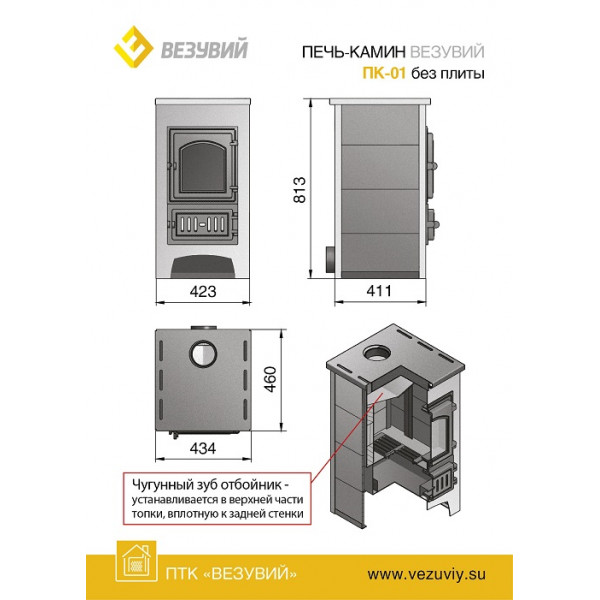 Печь-камин ПК-01 (270) от производителя Везувий. Работает на дровах. Предназначеная для обогрева помещений (дома, дачи) объемом до 150 м3. Для изготовления дровяной печи Везувий ПК-01 (270) используют высококачественную конструкционную сталь, что обеспечивает продолжительный срок службы более 10 лет. Элементы печи Везувий ПК-01 (270) выполнены из чугуна. Печь оснащена дверью Везувий 270, которая имеет жаропрочное стекло. Футеровка топки изложена шамотом из высококачественного сырья, по бокам печи Везувий керамические вставки. Печь-камин Везувий ПК-01 (270) работает до 5 часов на одной закладке дров. Также в печи предусмотрен - «Турбореактивный» режим разогрева, он обеспечивается за счёт подключения электрического вентилятора.