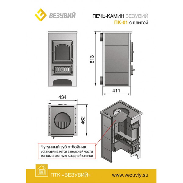 Печь-камин ПК-01 (270) от производителя Везувий. Работает на дровах. Предназначеная для обогрева помещений (дома, дачи) объемом до 150 м3. Для изготовления дровяной печи Везувий ПК-01 (270) используют высококачественную конструкционную сталь, что обеспечивает продолжительный срок службы более 10 лет. Элементы печи Везувий ПК-01 (270) выполнены из чугуна. Печь оснащена дверью Везувий 270, которая имеет жаропрочное стекло. Сверху печи расположена чугунная варочная плита, что позволяет готовить на ней пищу. Футеровка топки изложена шамотом из высококачественного сырья, по бокам печи Везувий керамические вставки. Печь-камин Везувий ПК-01 (270) работает до 5 часов на одной закладке дров. Также в печи предусмотрен - «Турбореактивный» режим разогрева, он обеспечивается за счёт подключения электрического вентилятора.
