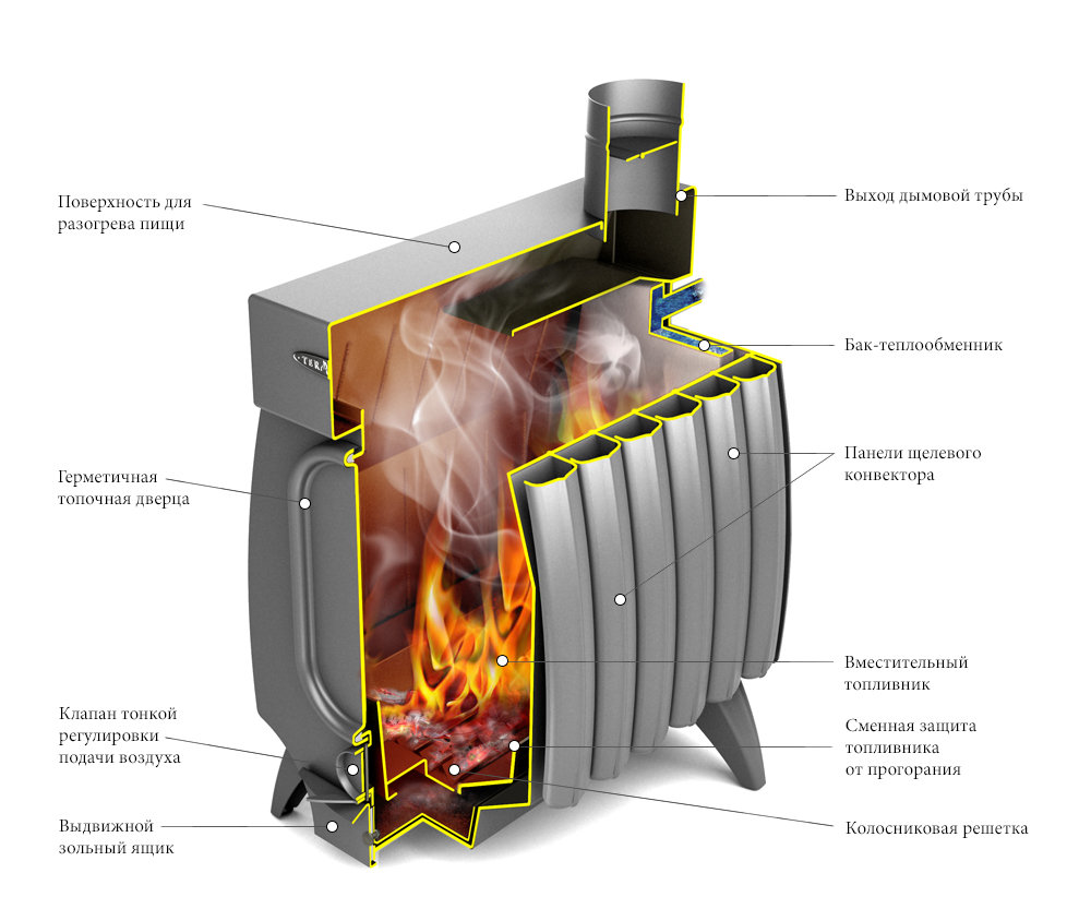 Самый вместительный топливник в своем классе позволяет вместить в печь максимальное количество дров для длительного непрерывного горения. Герметичный зольник с замком исключает неконтролируемый подсос воздуха на колосник. Тонкая регулировка интенсивности горения позволяет бесступенчато выбирать любой режим горения — от интенсивного до полного затухания печи.