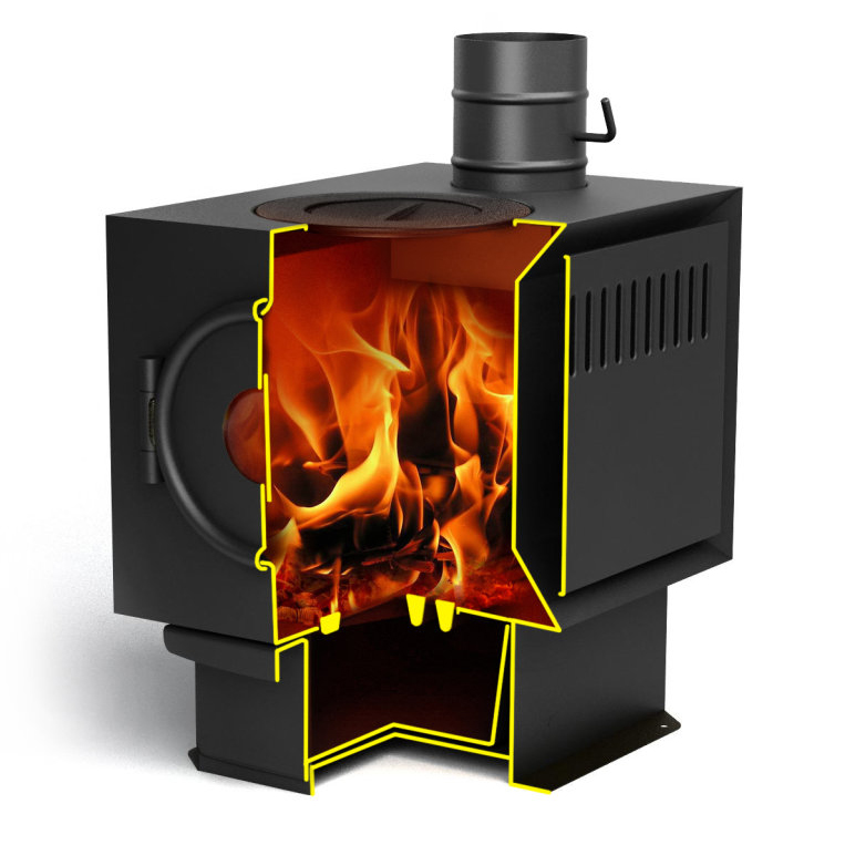 Дефлектор, отделяющий пространство топливника от патрубка дымохода, экранирует прямое излучение на дымоход, предотвращает избыточную тягу и нормализует процесс горения.